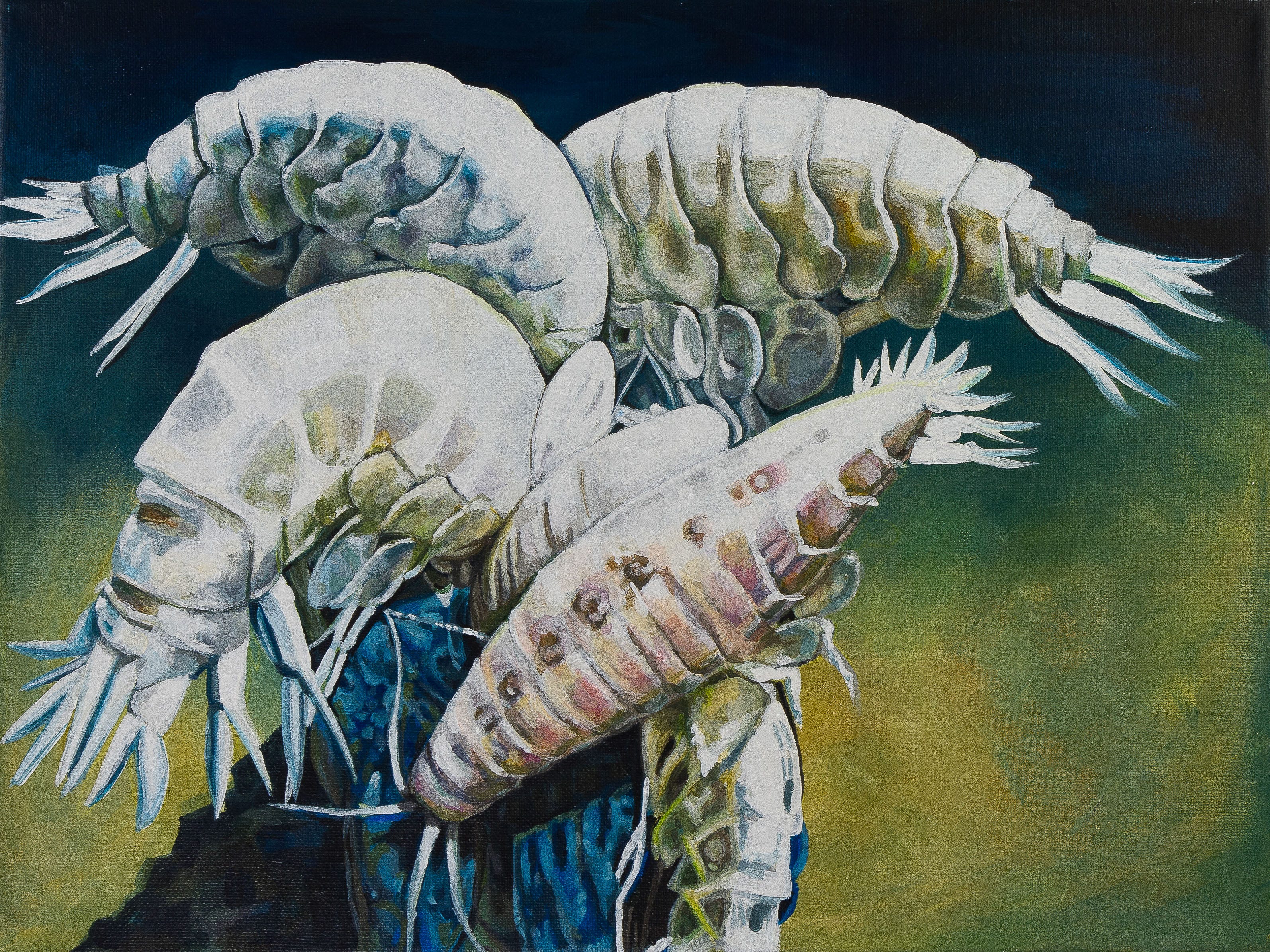 Meghan: Yeah, I love the photographs and I’ve been really lucky – Professor Jamieson’s been really generous with his photo permissions. You have to be a little bit careful with images from the deep sea: you’ve got to ask permission, and some places really want you to pay for permission, to use them. So he is just a really wonderful person. He’s like, “Yeah, absolutely, anything you want.” He’s a great supporter of the arts. He actually purchased the supergiant amphipod painting, which was like, mind-blowingly cool.