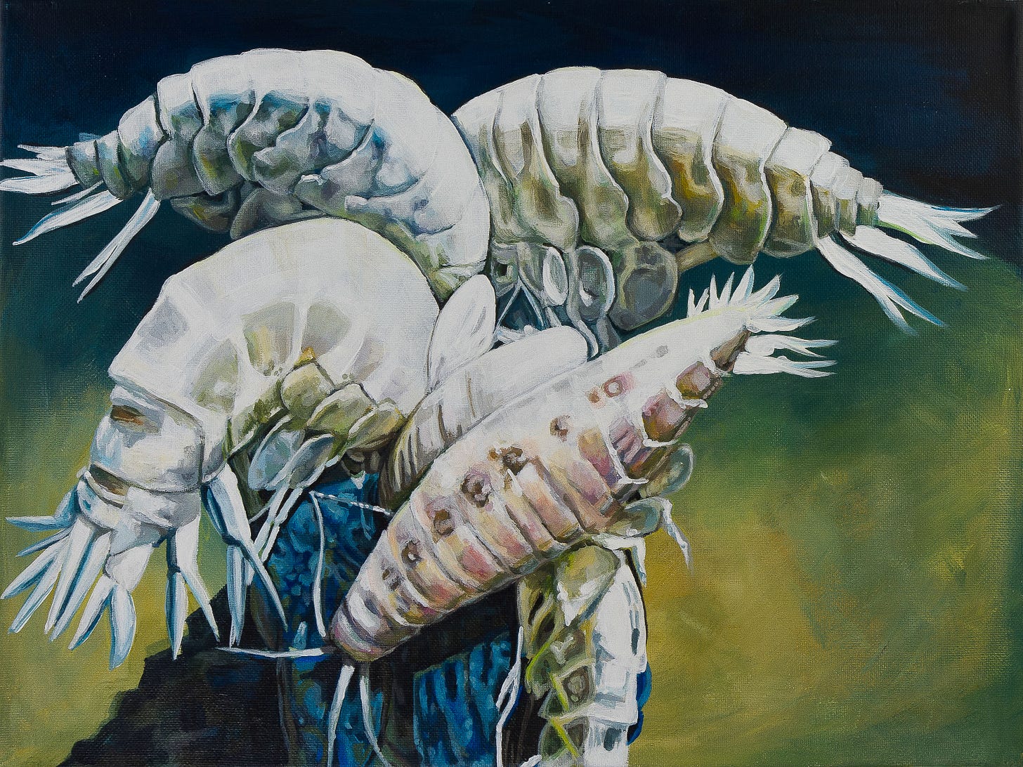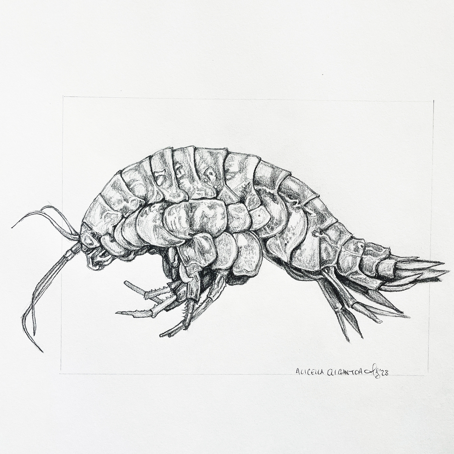 Meghan: Oh, good question. So the first sea creature I ever portrayed was a bigfin squid. And I had worked on a series of cephalopods and flowers together. But the first, like, proper deep sea creature was a supergiant amphipod: Alicella gigantea. And it was from a photo that Professor Alan Jamieson took – he’s the director of the Deep Sea Research Centre in Perth, Australia, at the University of Western Australia.