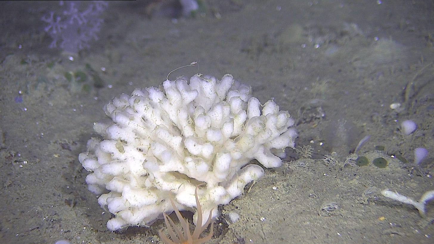 Dani Schmid, CEO of the resource-focused research company Bergwerk, showed the room video footage from a robot skimming over the deep seafloor. He highlighted a bushy white sponge, Lissodendoryx complicata, from the video.