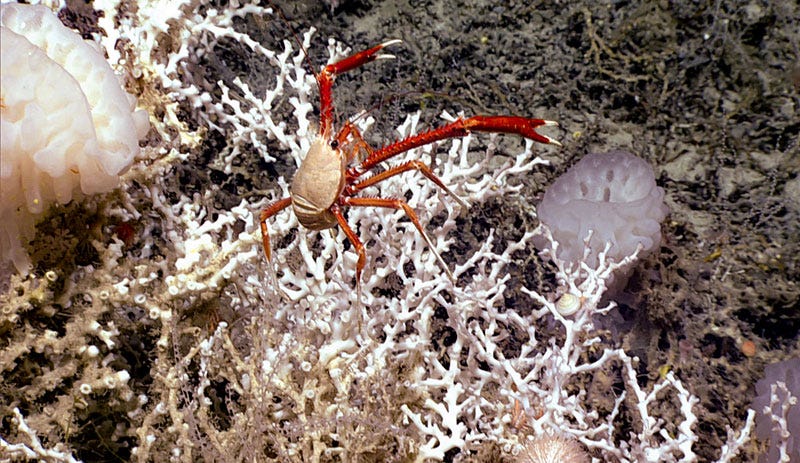 It's also right next to the world’s very first deep sea mining test site, as deep sea ecologist Dr. Andrew Thaler has pointed out. The Blake Plateau, the seabed formation where the reef grows, is rich in minerals as well as coral. In 1970, when deep sea mining was tested there, no one knew they were right beside the world’s biggest deep coral ecosystem. Had mining moved beyond the test phase then, there might have been no reef left to discover.